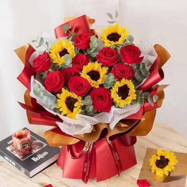 上海花千坊爱上海10朵红玫瑰五朵向日葵花束,按图包 |