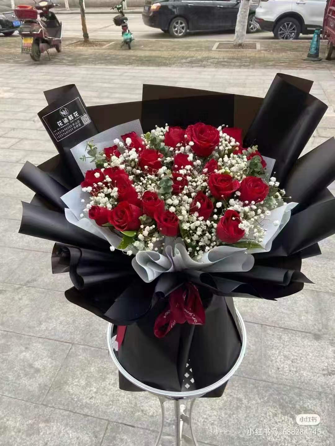 上海花千坊爱上海19支红玫瑰2支白百合配白满天星花束,如图 |