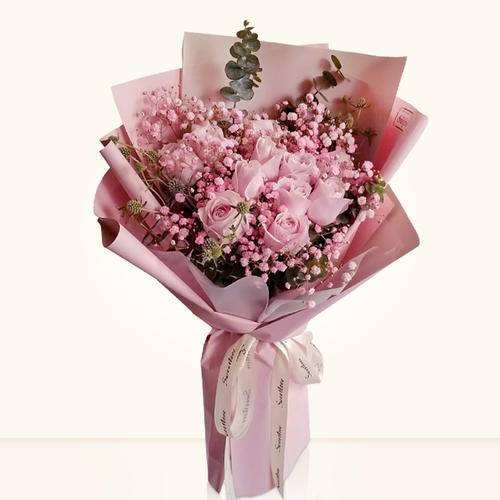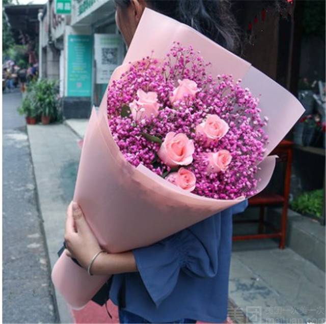 6朵粉玫满天星花束如图 |