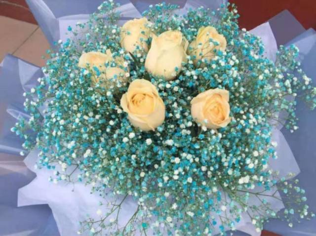 蓝色满天星加6朵香槟玫鲜花束,如图包 |