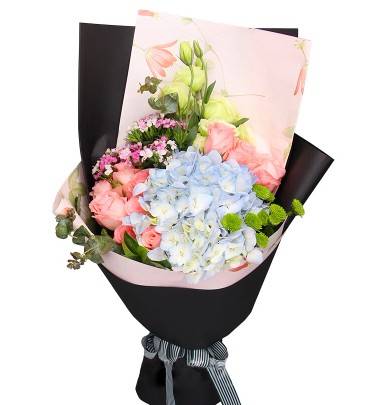 上海花千坊爱上海11朵粉玫瑰 1支蓝绣球 绿桔梗 粉色相思梅 绿雏菊 尤加利 里层粉色 外层黑色包装纸 灰色扎带 |