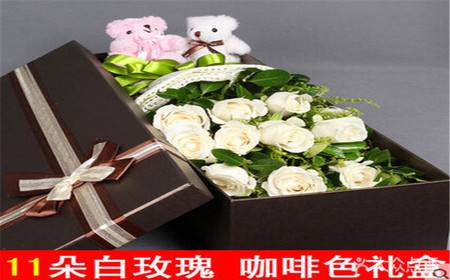 上海花千坊爱上海9朵白玫瑰加2朵粉玫瑰混搭礼盒送两小熊(把图中的白玫换2朵粉玫) |