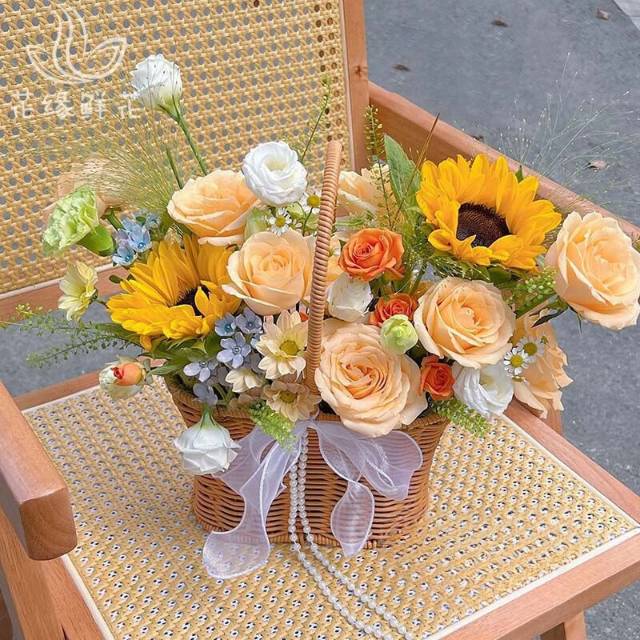 2枝向日葵11枝香槟玫瑰混搭鲜花手提花篮 |