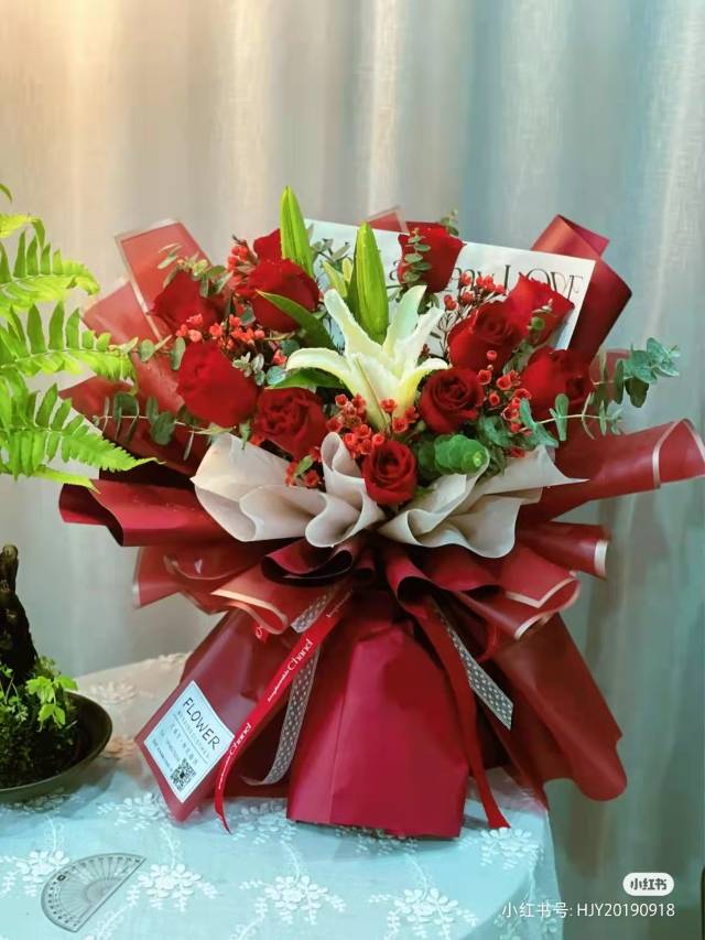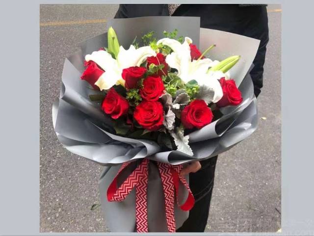11支红玫瑰2支多头白百合混搭花束 (红色包纸) |