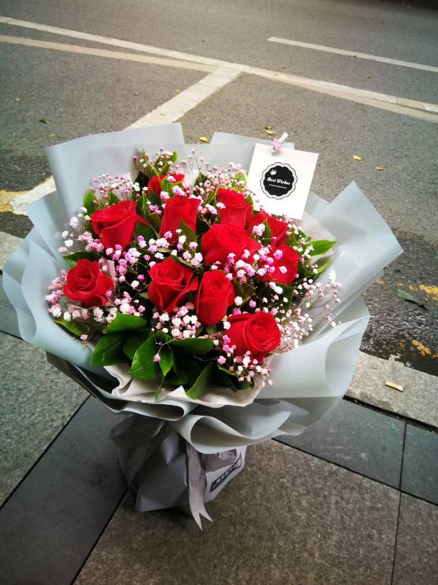 上海花千坊爱上海11朵粉玫瑰满天星花束,如图包 |