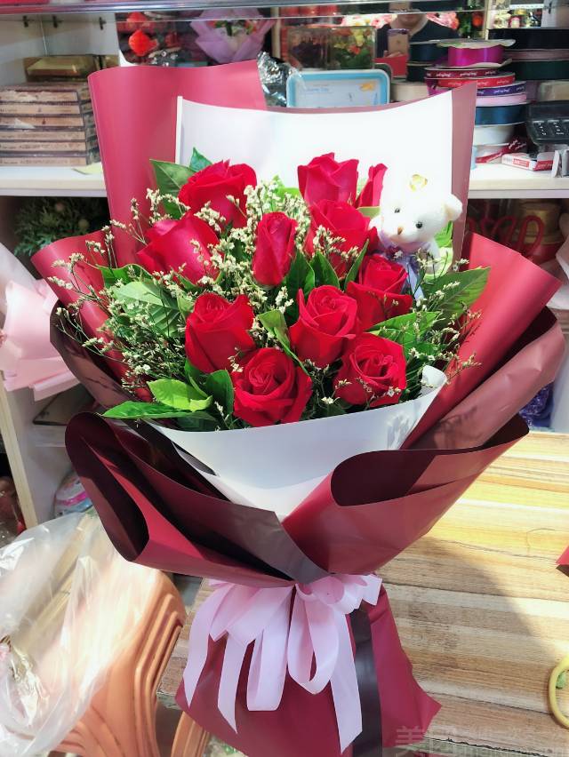 11朵红玫瑰一小熊花束如图 |