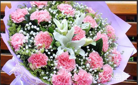 上海花千坊爱上海19朵粉康加4朵粉百合加3粉玫瑰加点配花做成花束 |