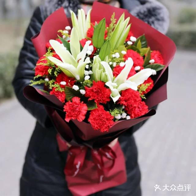 11支红色康乃馨2支多头百合,粉色包装纸,样式如图 |