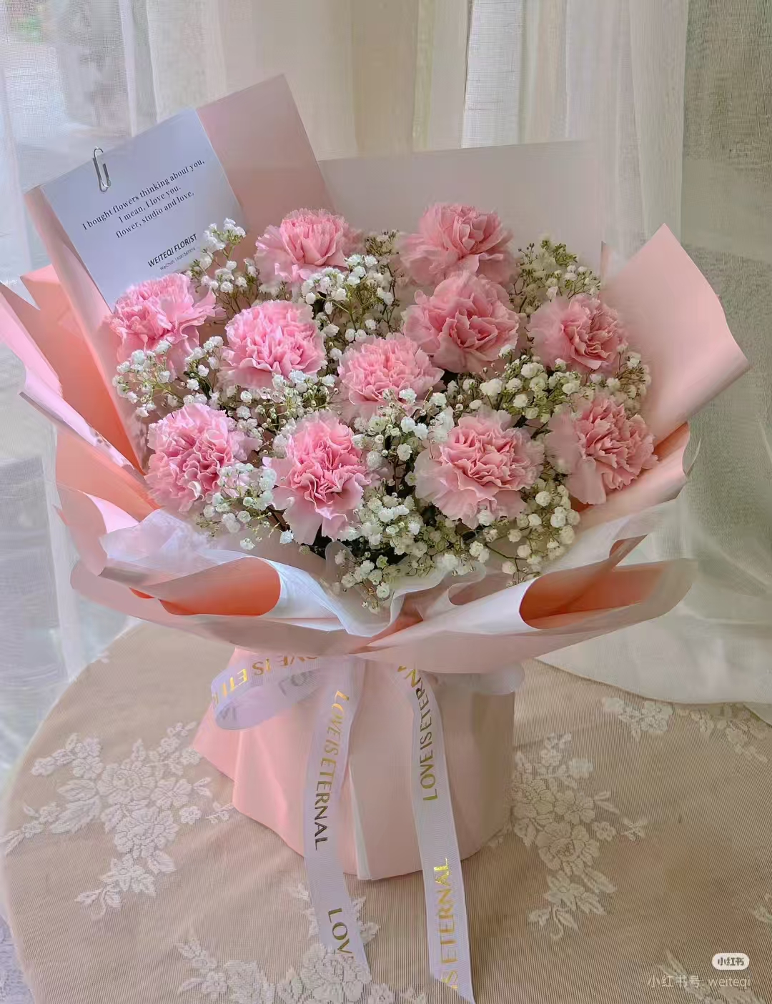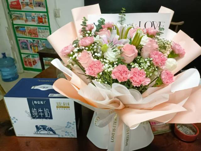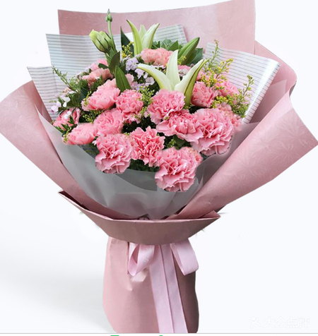上海花千坊爱上海19朵粉玫瑰粉康乃馨+2支粉百合花束,如图 |