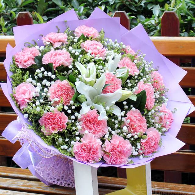 上海花千坊爱上海19朵粉康乃馨2支多头白百合混搭花束 数量:1 |