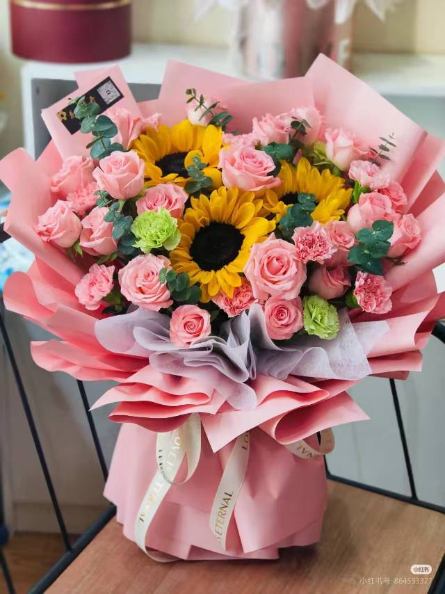 上海花千坊爱上海33朵粉玫粉康3朵向日葵混搭花束(图中绿色的不要) |