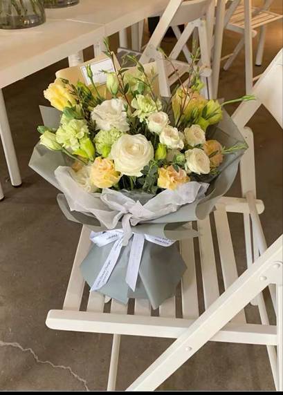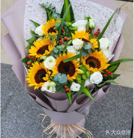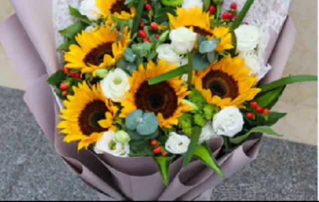 上海花千坊爱上海6朵向日葵9朵白色梗桔混搭花束,如图 |