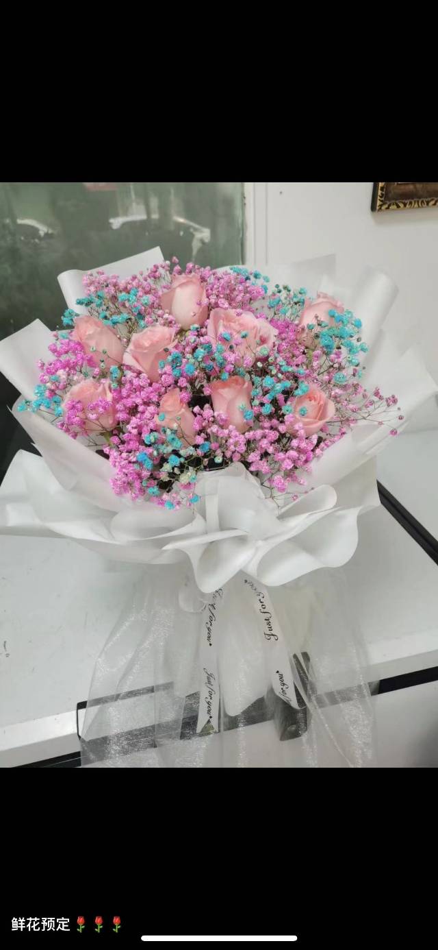 上海花千坊爱上海11朵粉玫瑰混搭粉蓝星鲜花束 ,如图包 |