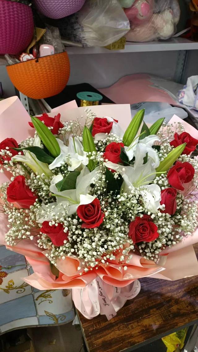 11支红玫瑰2支多头白百合满天星花束(包装纸换成红色的) |