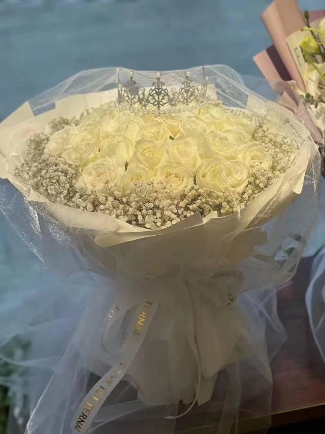 52支白玫瑰+香槟玫瑰花束,白纱款加皇冠 |