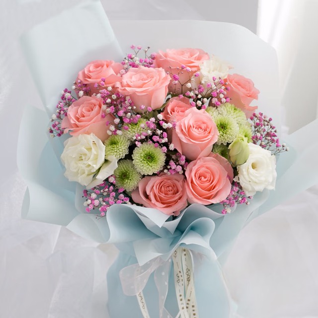 9朵粉玫瑰2朵白玫瑰混搭满天星花束 |
