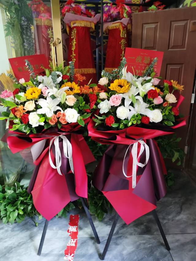 玫瑰百合向日葵混搭开业花篮一对,如图 |