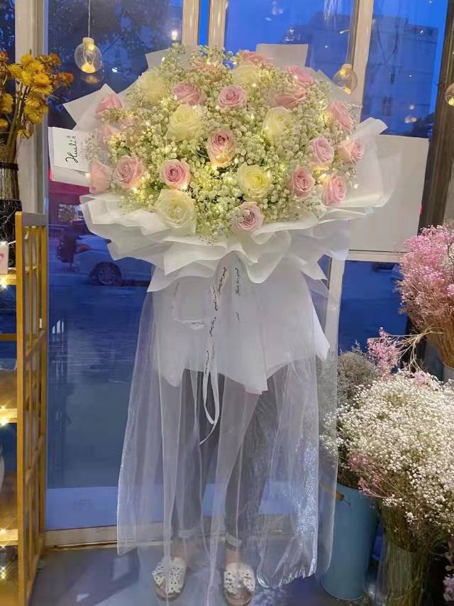 上海花千坊爱上海33支粉玫瑰白玫瑰满天星混搭花束 加白纱 按图包 |