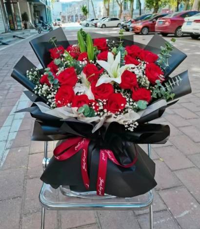 33朵红玫瑰2支多头白百合花束,如图 |