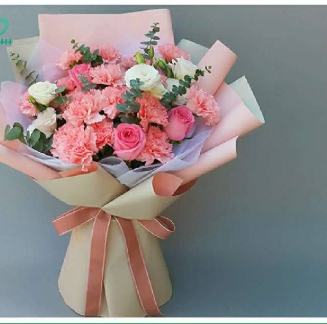 19朵粉康乃馨5朵粉玫瑰加桔梗花束,如图制作 |