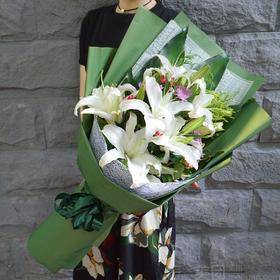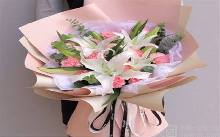 上海花千坊爱上海19支粉康3支多头白百合花束,如图包装大气好看,做好就送。 |