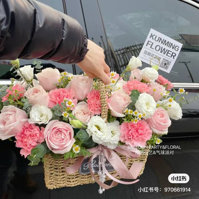 33朵粉玫瑰粉康乃馨混搭手提花篮 |