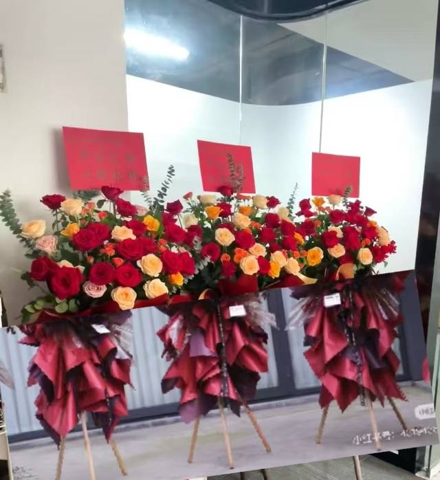 红玫瑰+粉玫瑰开业花篮一对(粉色可少点)红色包装纸、黑色丝带 |