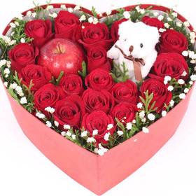 19朵红玫1苹果1小熊心形礼盒如图,有卡片 |