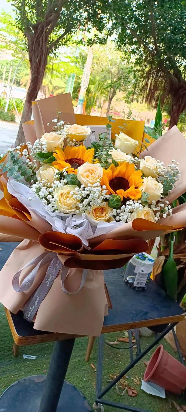 11朵香槟加2朵向日蓝星加配花,用图二的包装纸 |