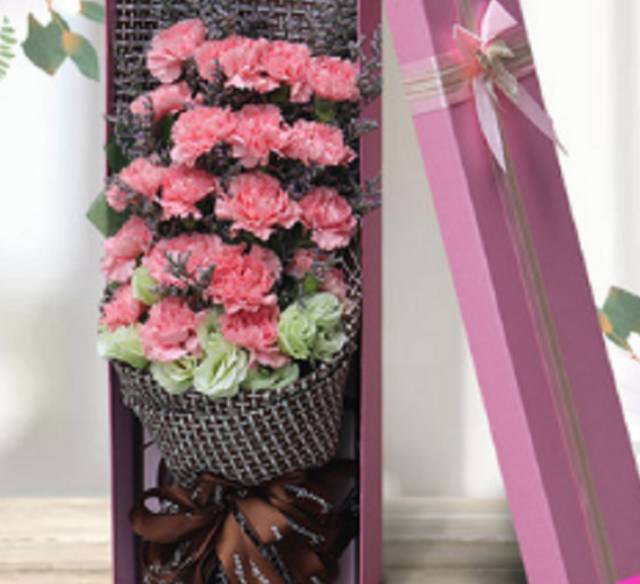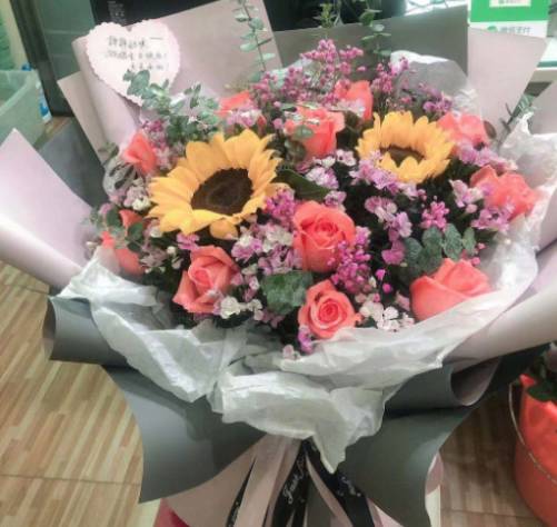 11朵粉玫瑰两向日葵满天星花束,如图包装 |