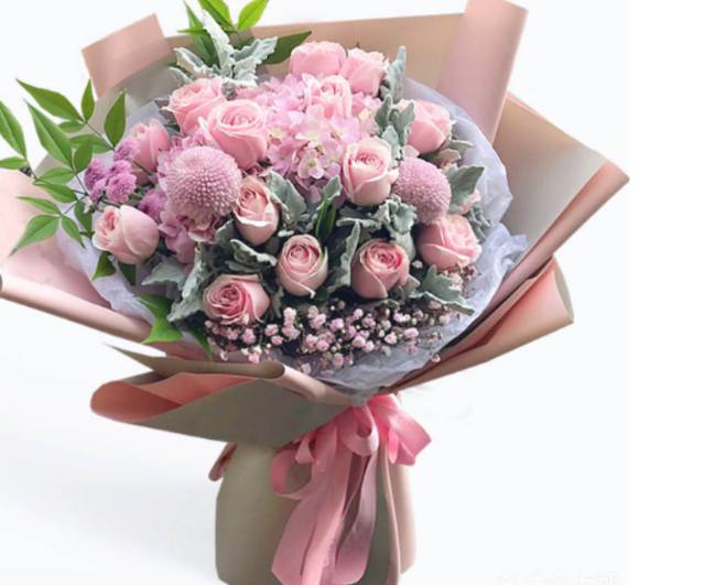 上海花千坊爱上海15支粉玫瑰2支粉绣球2支粉乒乓菊混搭花束 |