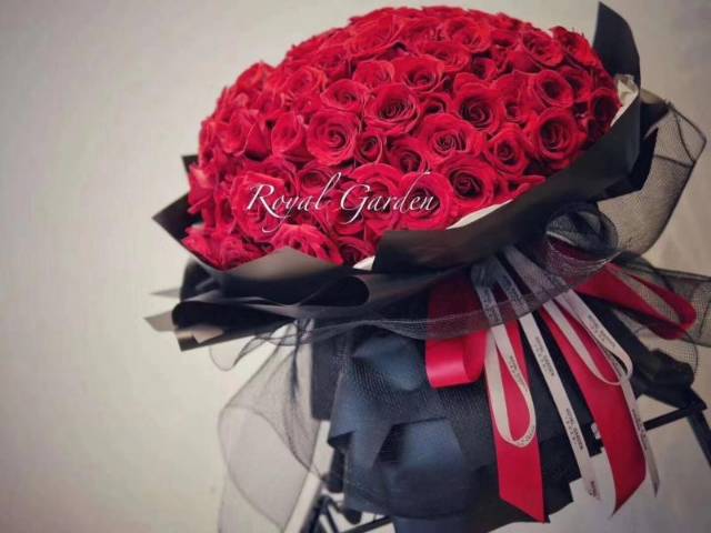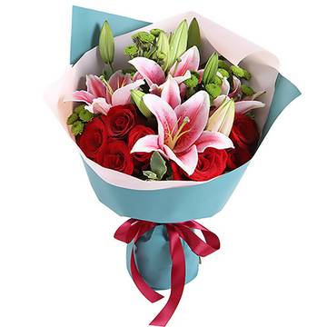上海花千坊爱上海9枝红玫瑰,2枝粉色多头百合配红豆栀子叶 鲜花包装:内衬浅粉色雾面纸,外用蓝色雾面纸单面包装,红色蝴蝶结束扎。如图制作 |