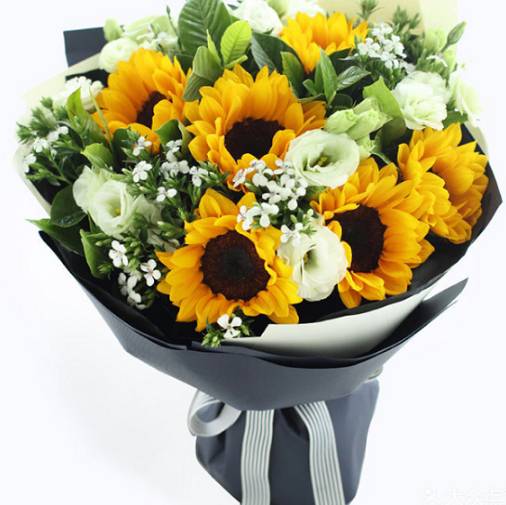 6朵向日葵混搭梗桔花束 款式包装如图 (洋桔梗可以用紫色的,搭配要好看,花材新鲜) |