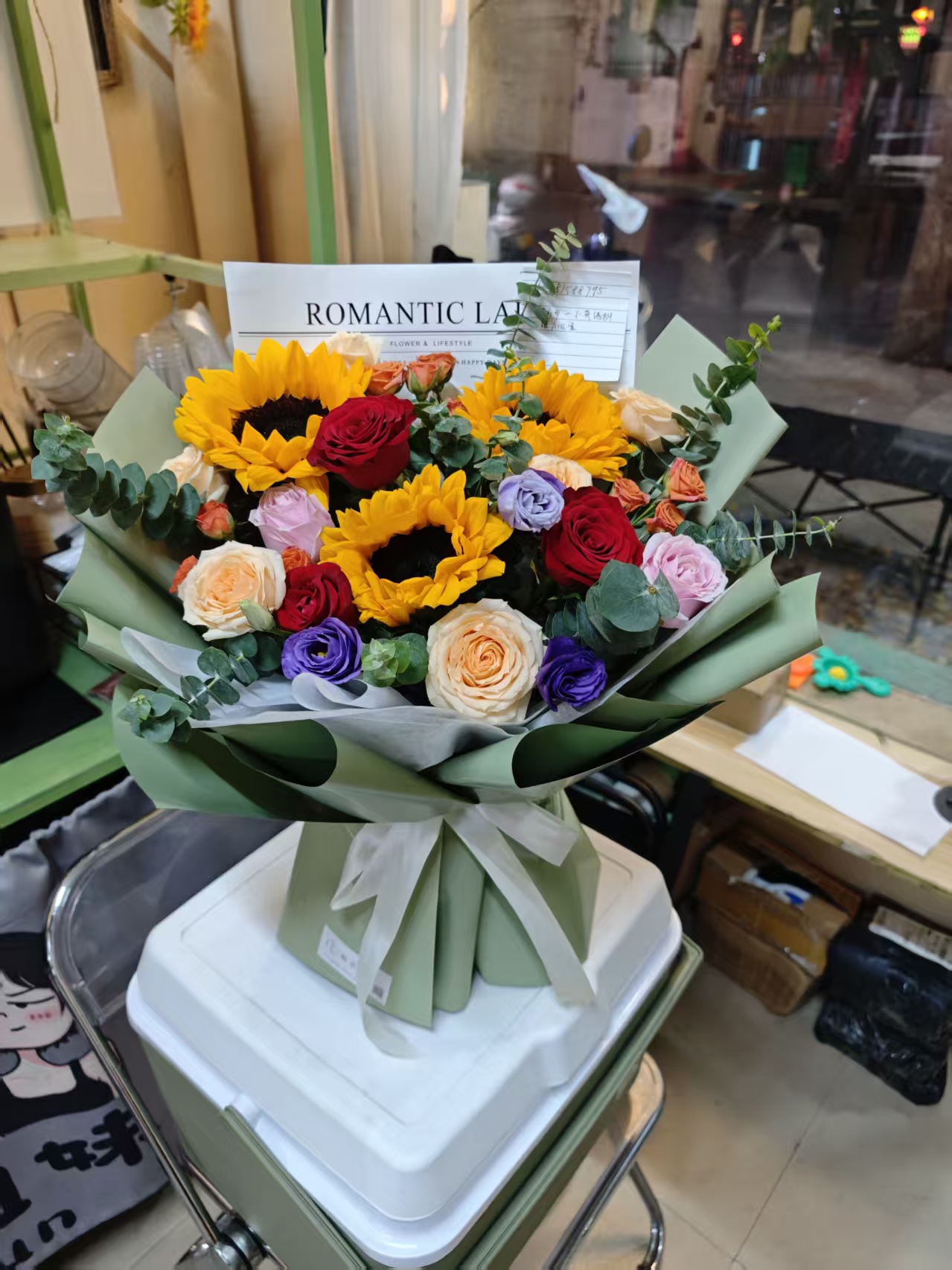 19支红玫瑰2支多头白百合配白色满天星花束,加灯 |