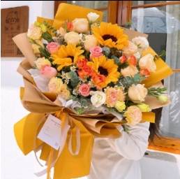 上海花千坊爱上海玫瑰向日葵混搭花束,花材看图(包装纸换成粉色纸) |