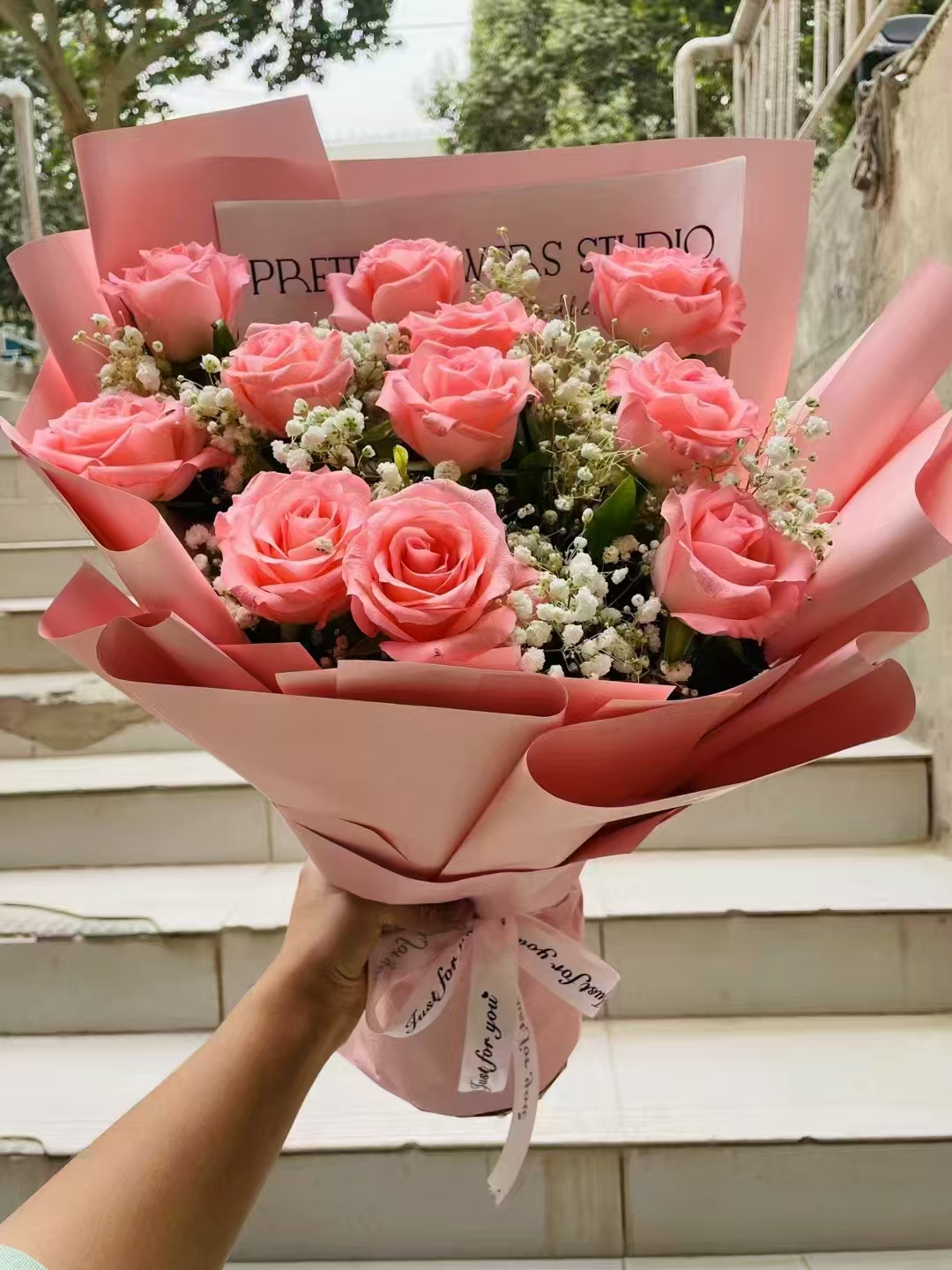15朵粉玫15朵粉康乃馨2支多头百合配满天星绿叶混搭花束,如图 |