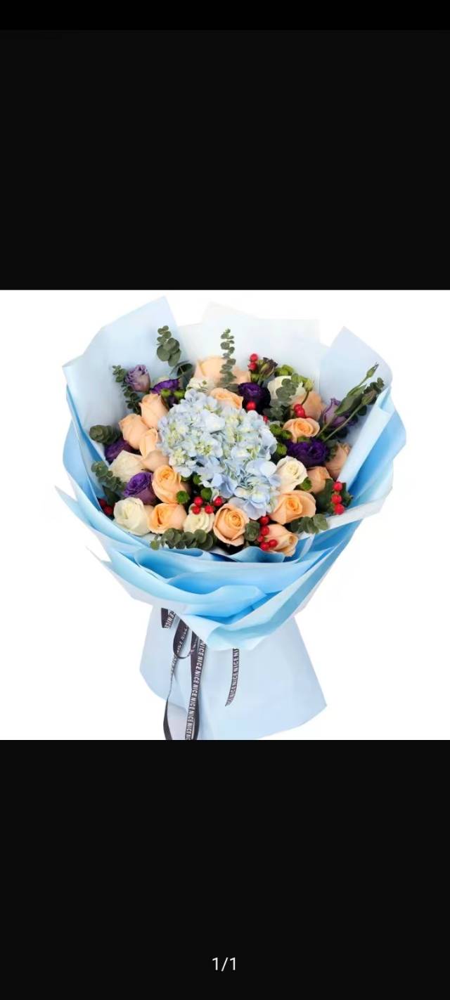 15朵香槟加6朵白玫加7朵紫玫混搭绣球花束如图 |