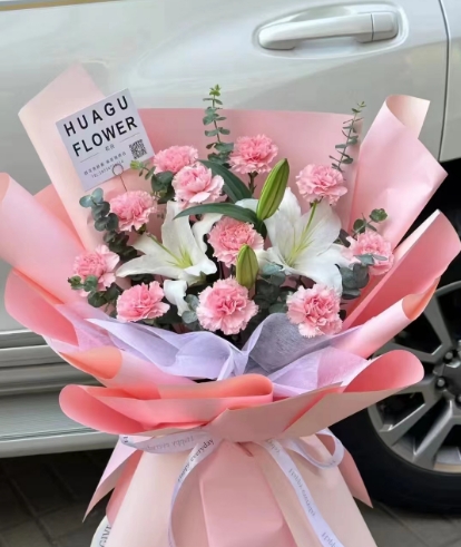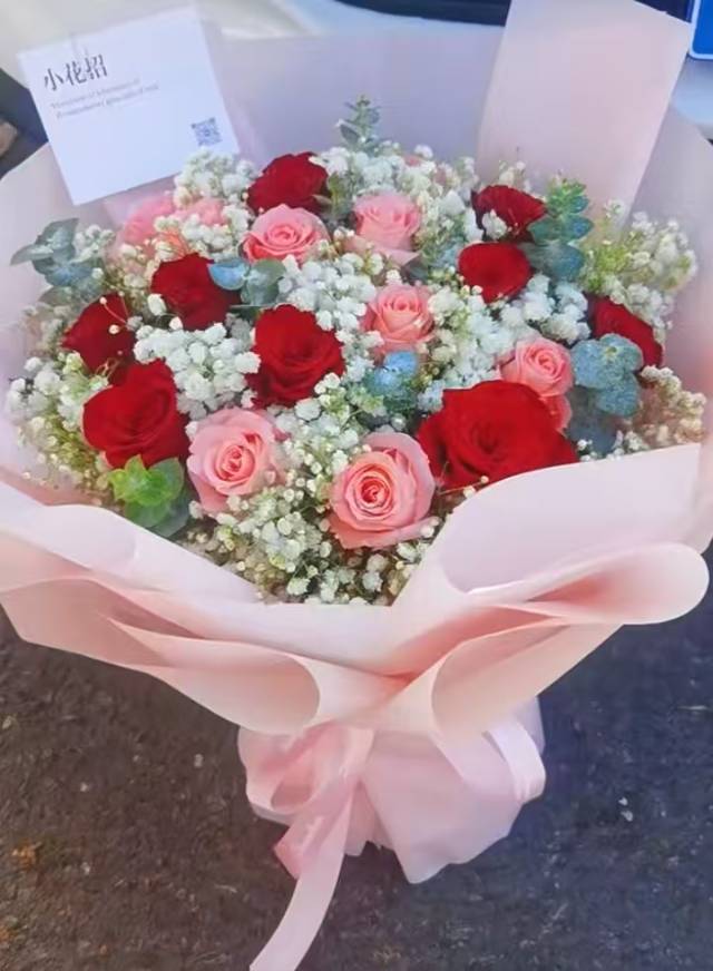上海花千坊爱上海8朵粉玫瑰+8朵红玫瑰配满天星花束,如图 |