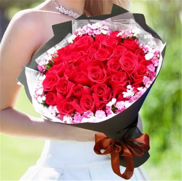 6朵粉玫瑰蓝粉满天星混搭花束,如图