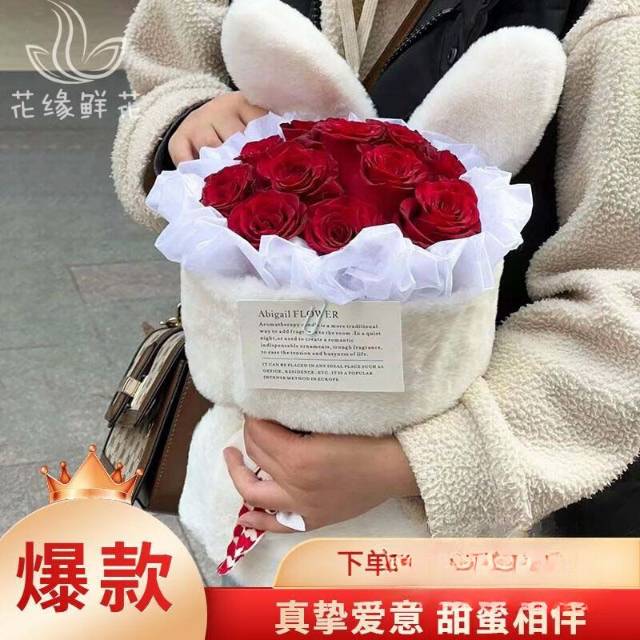【兔子耳朵花束】11枝红玫瑰白兔子花束 |