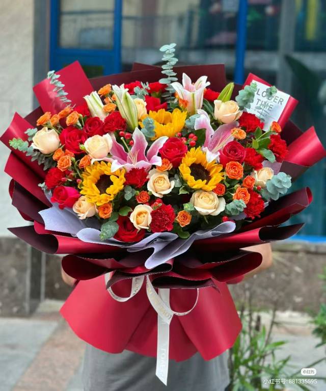 12朵红玫12朵香槟12朵红康乃馨3朵向日葵3支多头粉百合加配花,如图 |